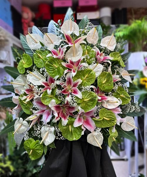 - آنتریوم سبز و کرم: گل لوکس با بافت براق و رنگ خاص، چیده شده در اطراف لیلیومها